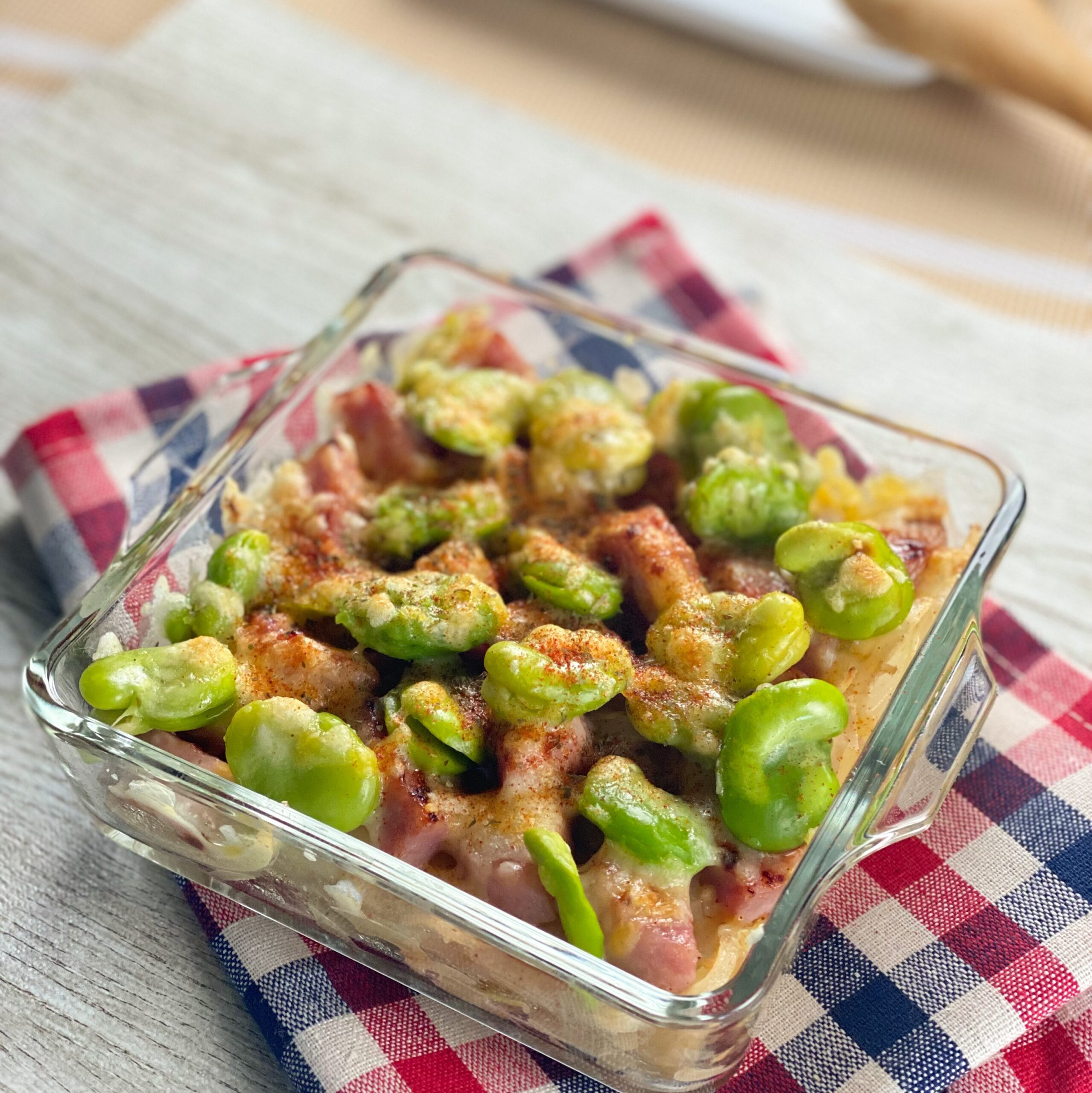 ⑤耐熱皿に玉ねぎ→ソーセージ→そら豆→チーズの順に乗せ、焼き目がつくまでトースターで焼けば完成♪