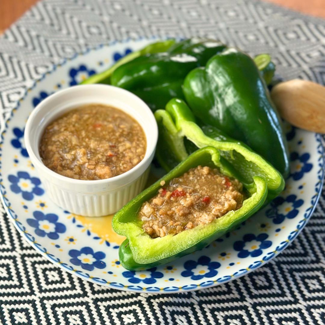 ②ピーマンは半分に切り、種を取って洗い、水気を拭きとる