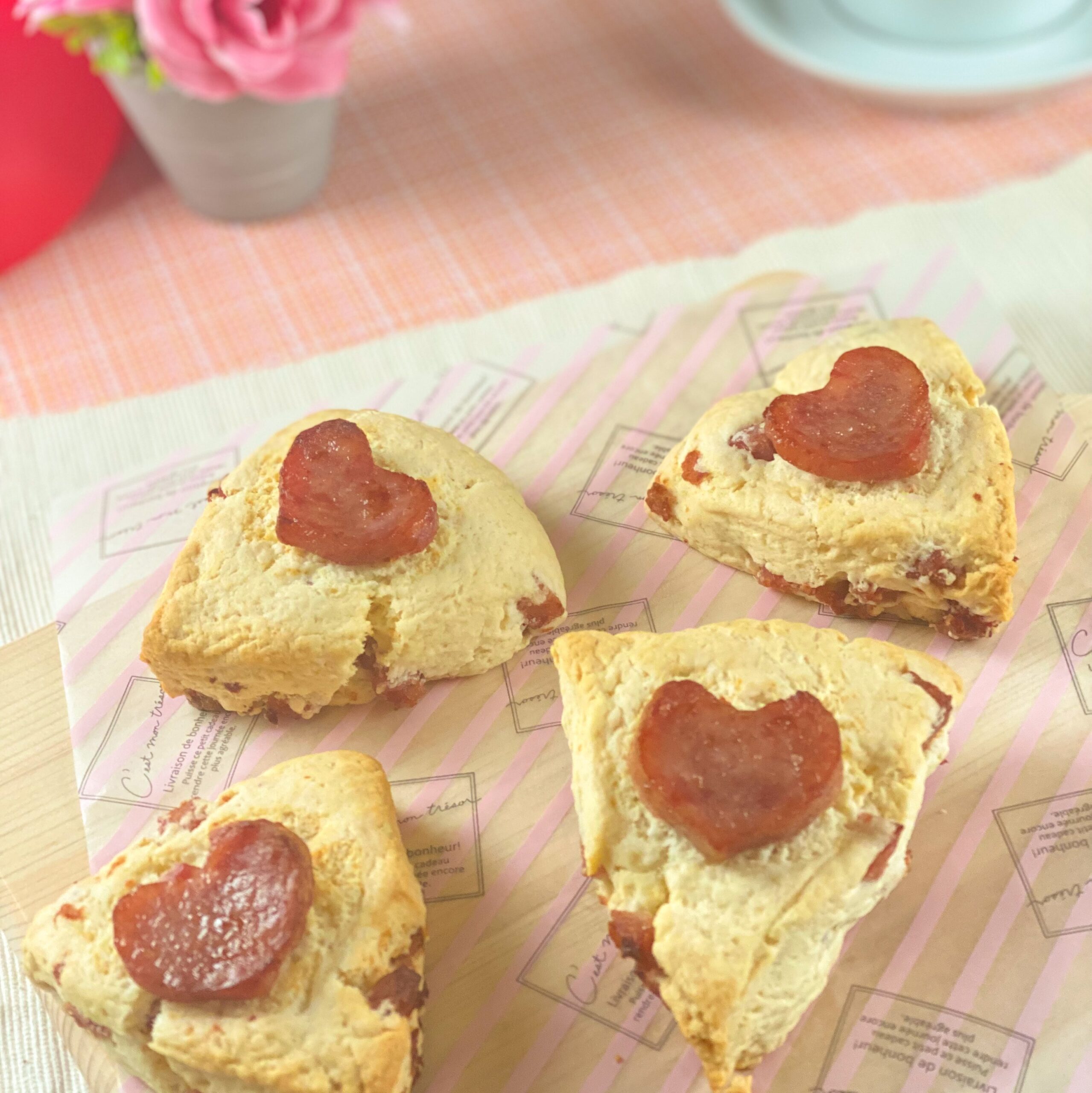 ④スコーンの形にカットし、ハート型のソーセージを上に載せる