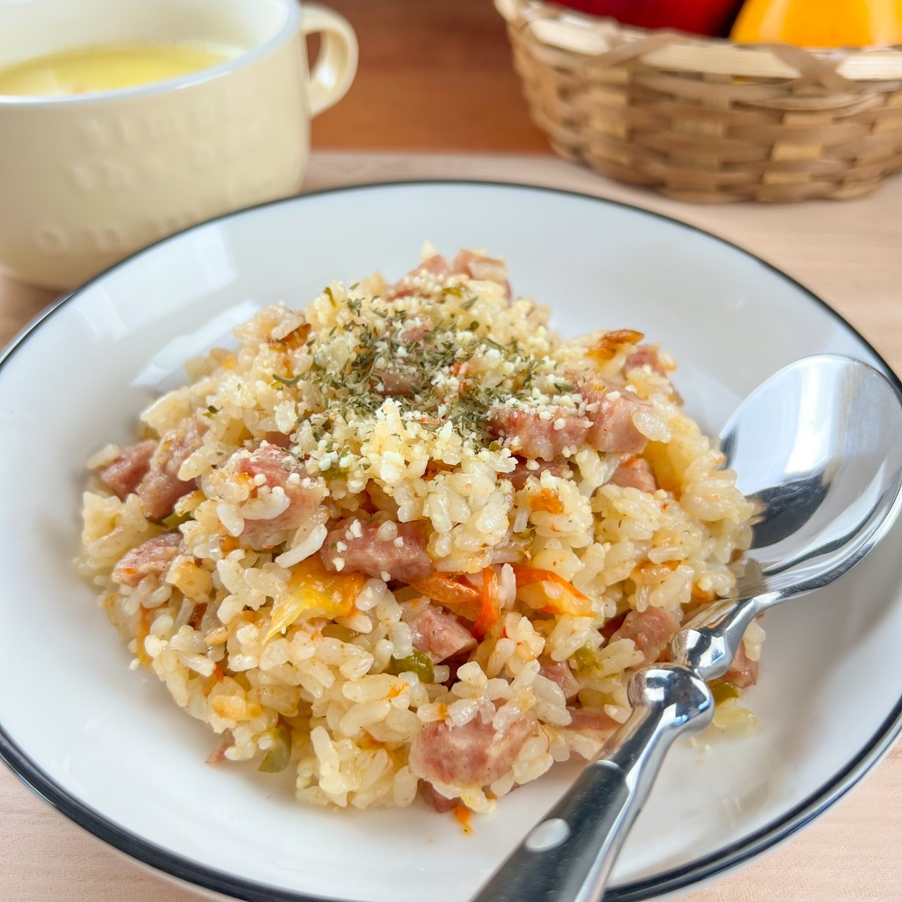 ③炊飯器にお米、②、コンソメ、水を入れて炊飯する