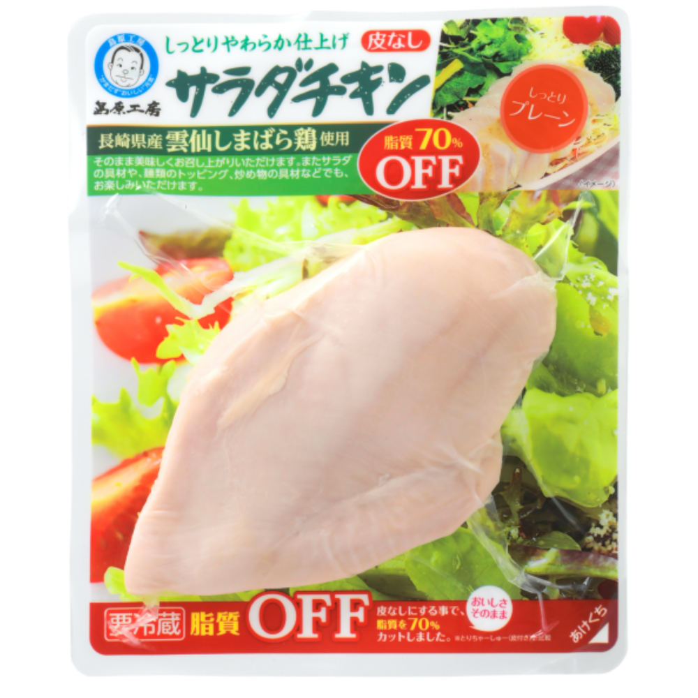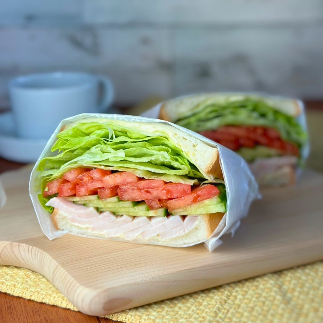 ⑤パンに片側中央にレタス→トマト→きゅうり→サラダチキンの順に具材を積み上げ、もう片方のパンを被せる