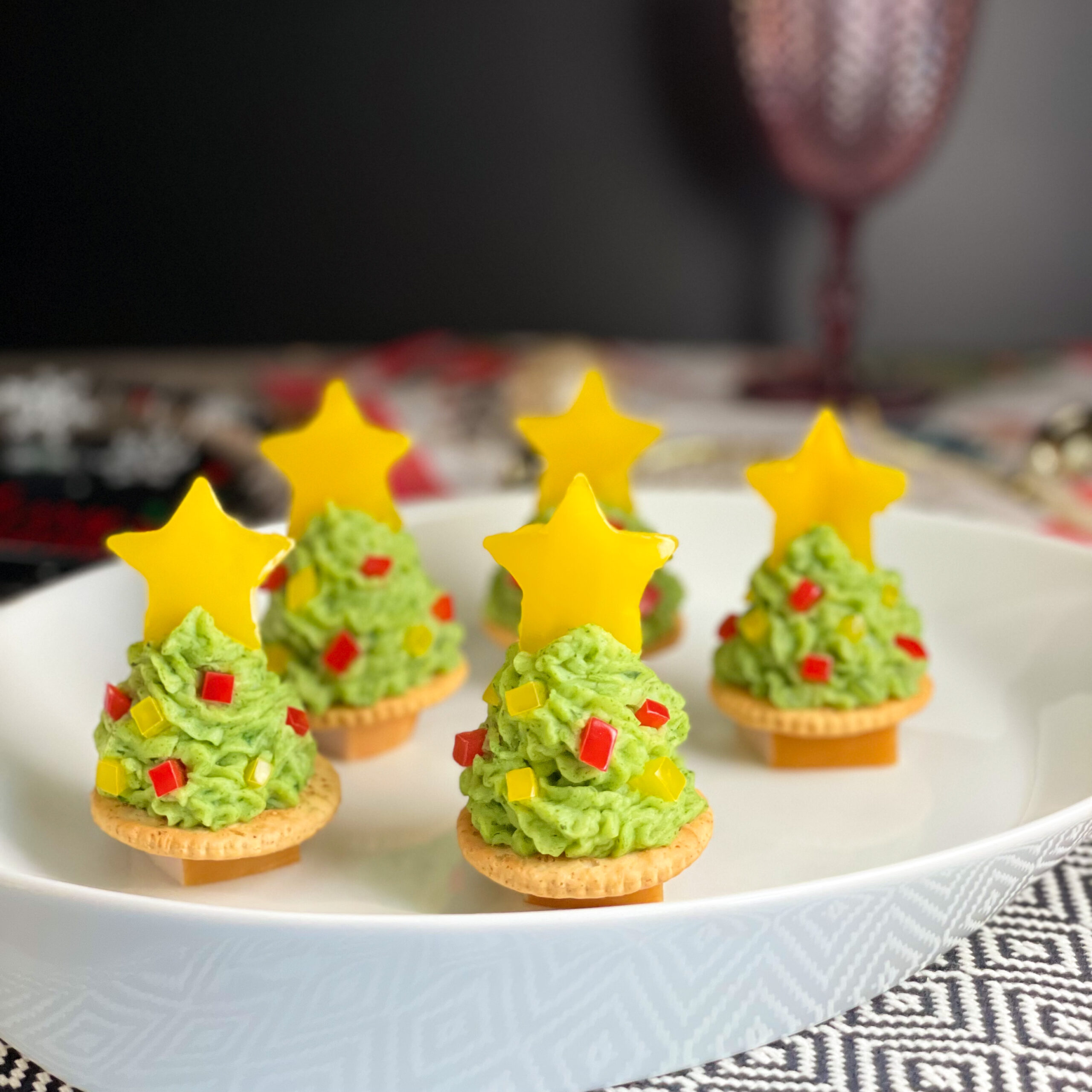 ④黄パプリカは星形でくり抜き、残りはみじん切りにしてツリーに飾り、サラダチキンは四角に切ってツリーの下に置く(※中央に爪楊枝を差すと安定します)
