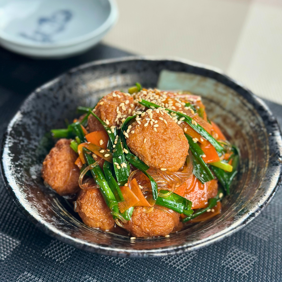 ④大豆ミートボールとニラを加え、ふんわりラップをしてさらにレンジ600Wで2分加熱する
