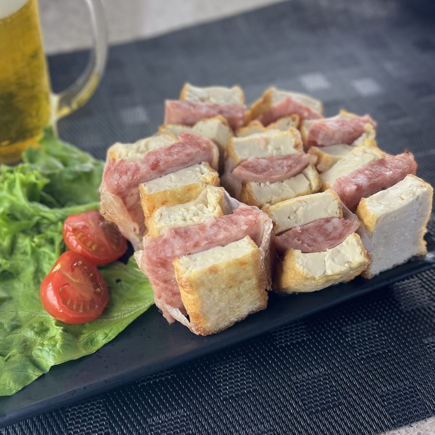 ②厚揚げ→ソーセージ→厚揚げの順に挟み1組にする(合計3組つくる)