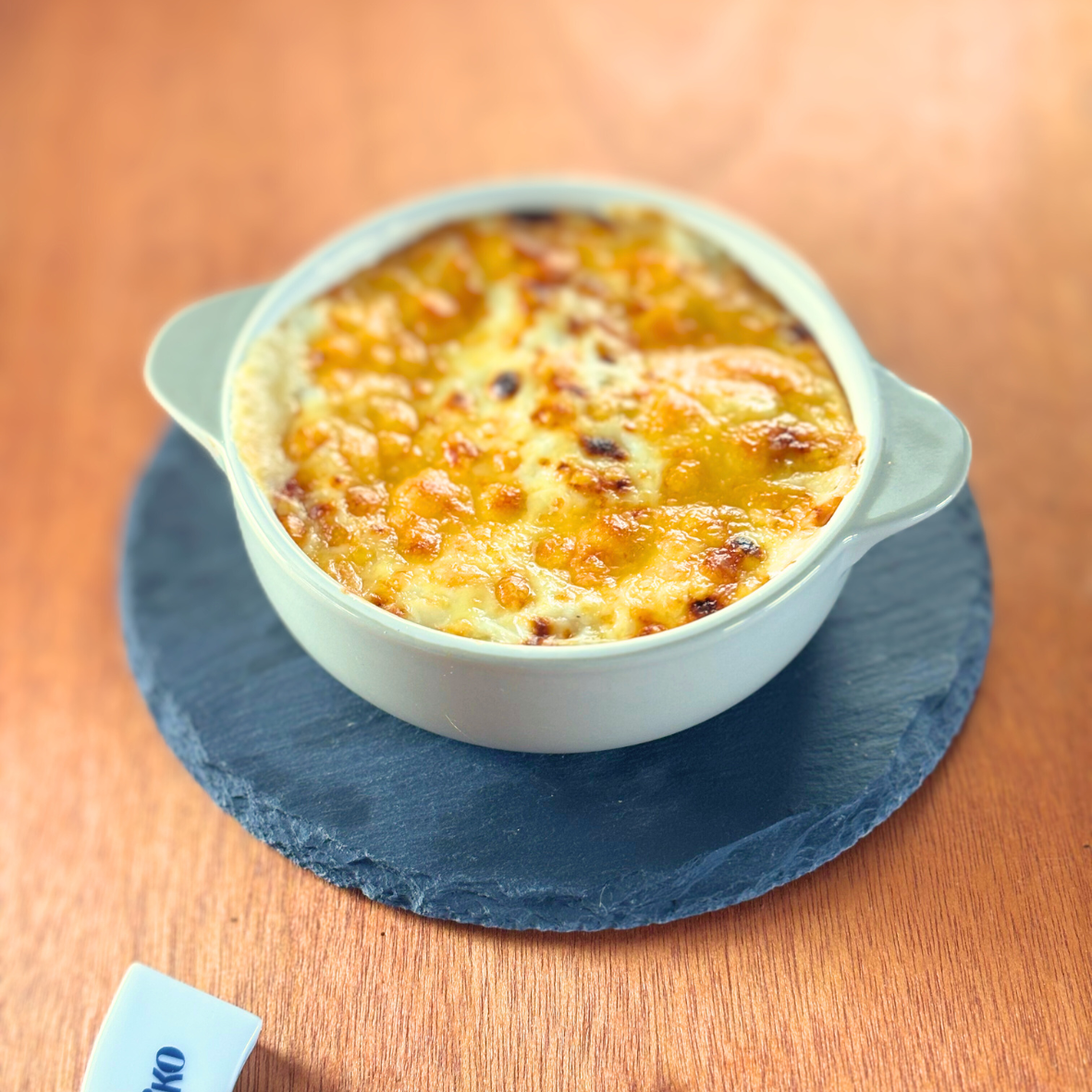 ⑤耐熱容器に3の1/3量、餃子の皮3枚、4の麻婆豆腐1/2量、餃子の皮3枚、3の1/3量、餃子の皮3枚、4の麻婆豆腐1/2量、餃子の皮3枚、3の1/3量を順に重ねたら、最後にピザ用チーズをのせる