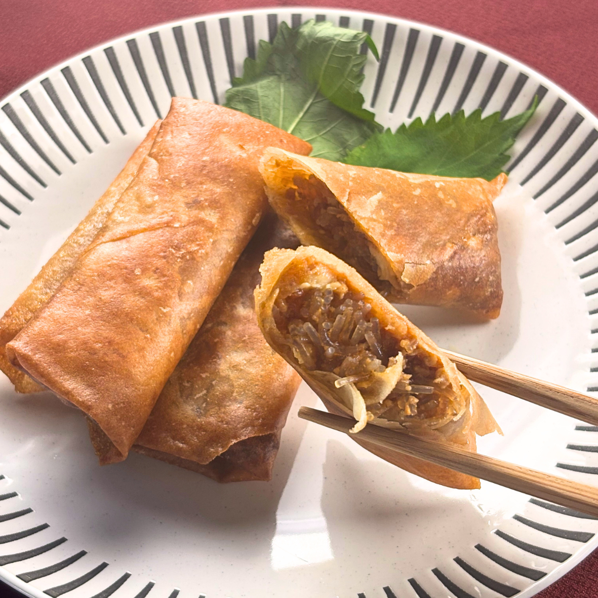 ⑥お皿に大葉を飾り、そこに春巻きをのせたら完成!